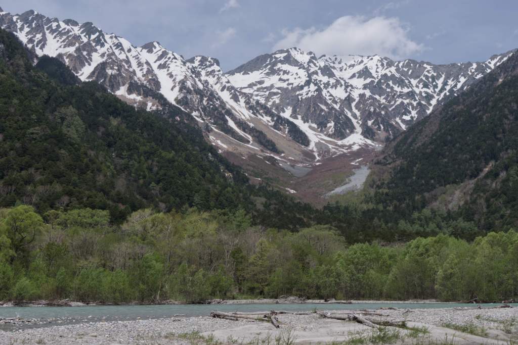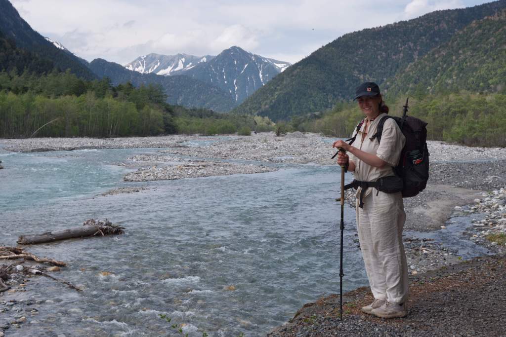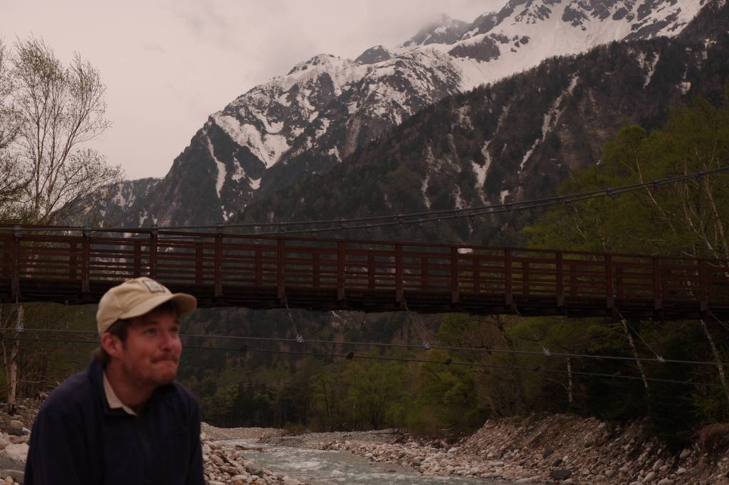 The night is spent just outside of town, toward Kamikochi, a remote hiking area in the Japanese Alps. Only accessible by bus or taxi, we found the most economical way to get there was to take the bus at Sawando Station. We pack our backpacks and leave RokkyPokky. The area in Kamikochi is beautiful, a long valley surrounded by peaks up to 3000 meter high. However, it is made accessible for every level of fitness and experience and is therefore extremely crowded—already now, in May. The main path leads along the river, through the valley and back on the other side. There are a lot of ice cream and food places—more than necessary, in our opinion. The further you walk from the bus terminal, the fewer people you encounter, and we end up almost alone at the furthest campground.