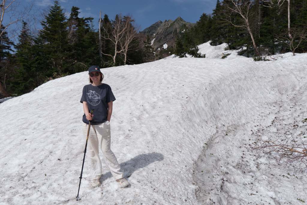 The real hiking starts when you get on a trail uphill leaving the crowd behind. In summer, it must be beautiful walking along the mountain ridges that overlook the busy river walk. For this, we are too early, but we spontaneously decide to try to reach Mount Nishiho (2674 m.a.s.l.). After a 1,000 m elevation gain, we make it to the hut (2360 m.a.s.l.) beneath the peak, but time is pressing, and half the trail is covered in snow, making us slow. We have to turn back, but before we do, we enjoy an avocado toast in the sun. Between carefully anchoring our heels in the snow and intentionally sliding down, we make it back to the terminal just in time to catch the bus out, back to RokkyPokky.