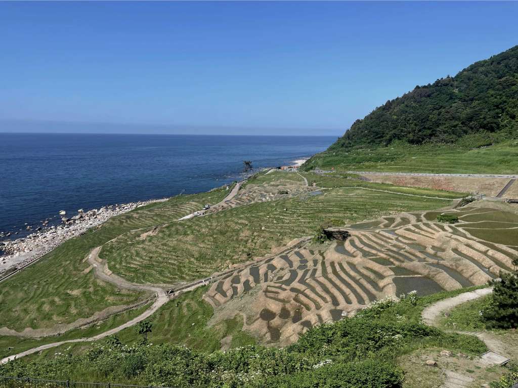 We spend almost two days on the little beach with a shrine in the water and even go for our first ocean swim of the year. After leaving, we realize it was a good idea to relax there as much as possible. The beaches along the peninsula are either beautiful but inaccessible due to rocky cliffs, or shadeless and with protection walls in the water, which make them a bit uninviting. On top of that, an earthquake in January 2024 had severely damaged the coast. We pass a lot of landslides, and constructions on the road are plentiful! A lot of holes and cracks in the roads have to be avoided. Therefore, we road trip slowly, stopping here and there for a nice view or a little walk. On the other side, we visit the Salt Village Museum, which is so interesting! Not only is there a detailed explanation about the production of salt in different periods, but you can also watch the workers while they go on with the salt-making production.